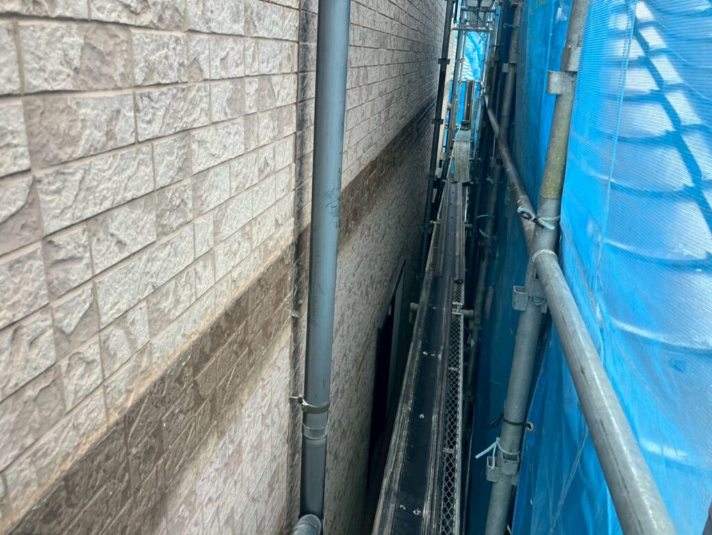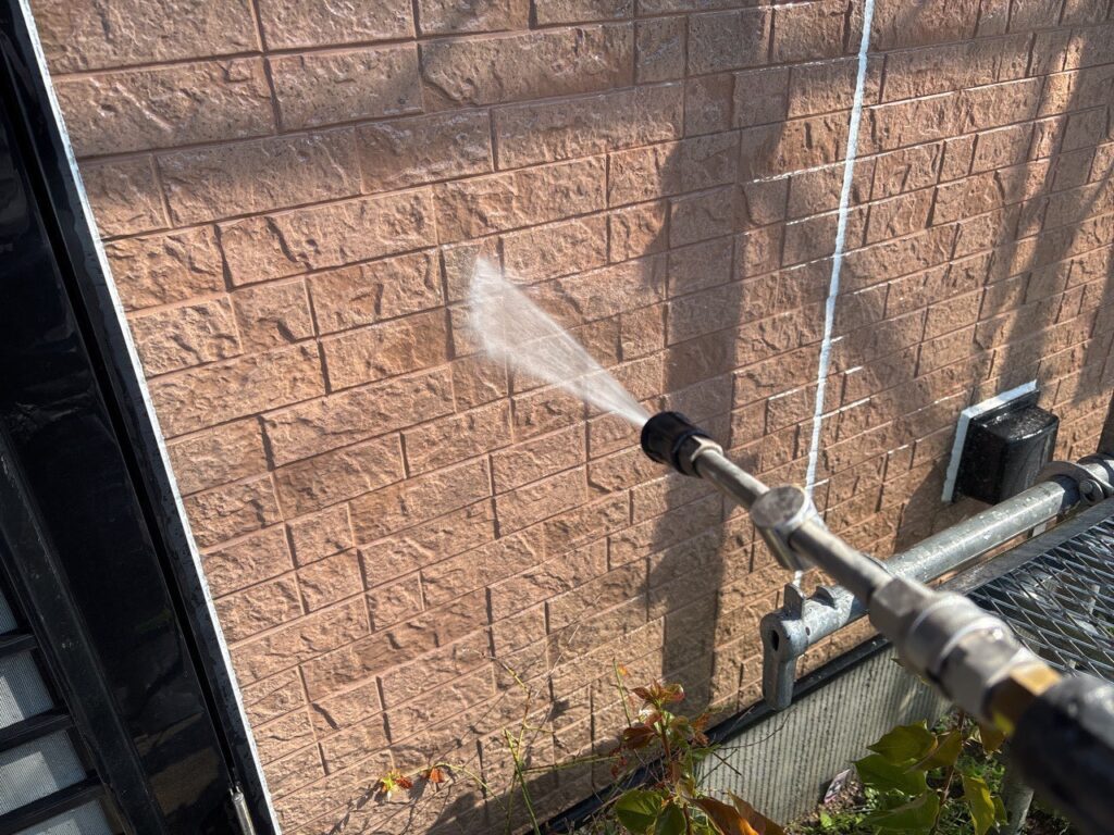 コーキング材がしっかり乾いたら、高圧洗浄機で外壁の汚れ・コケ・古い塗膜を洗い流します。