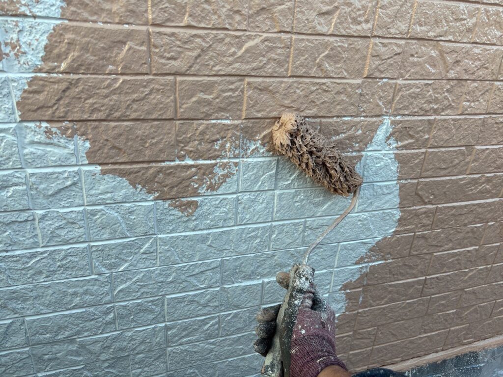 凹凸のあるサイディング材には毛足の長いローラーを用いて丁寧に塗っていきます。