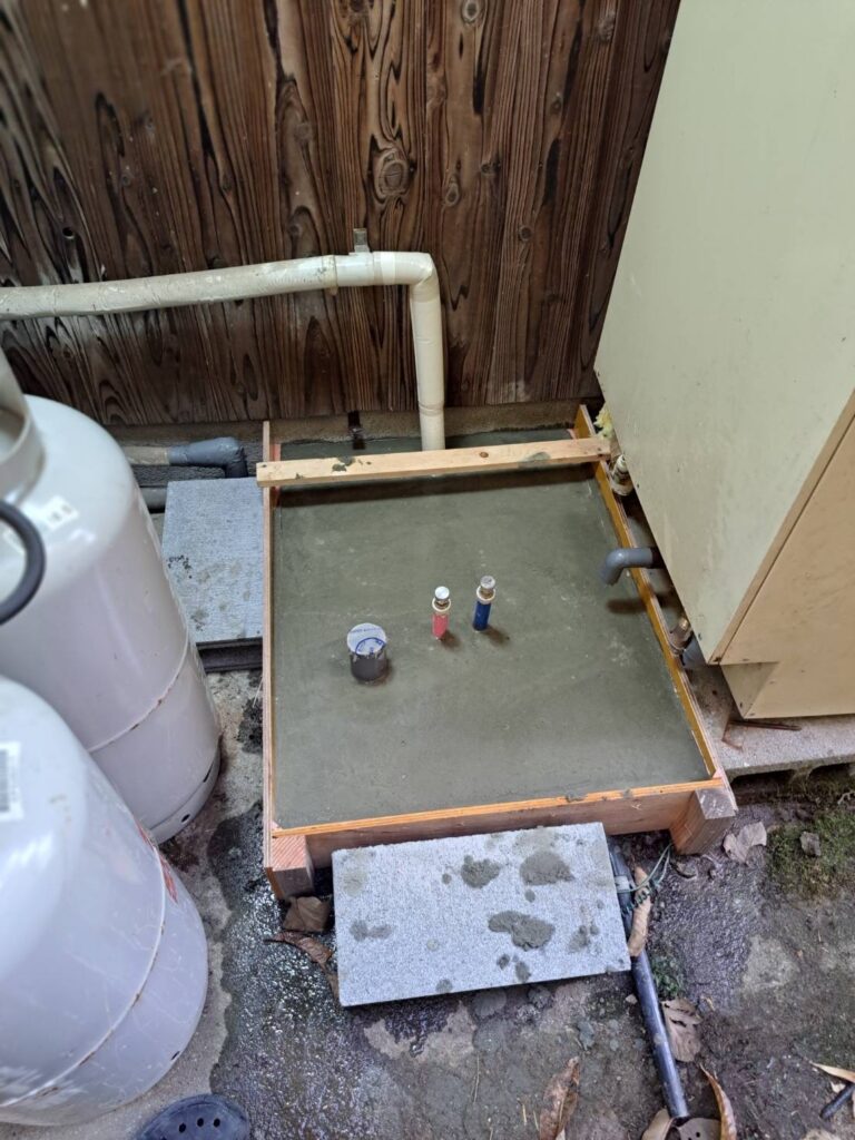 新しい電気温水器は配置位置が変わるため、まずはコンクリートで基礎ベースを新たに打設します。