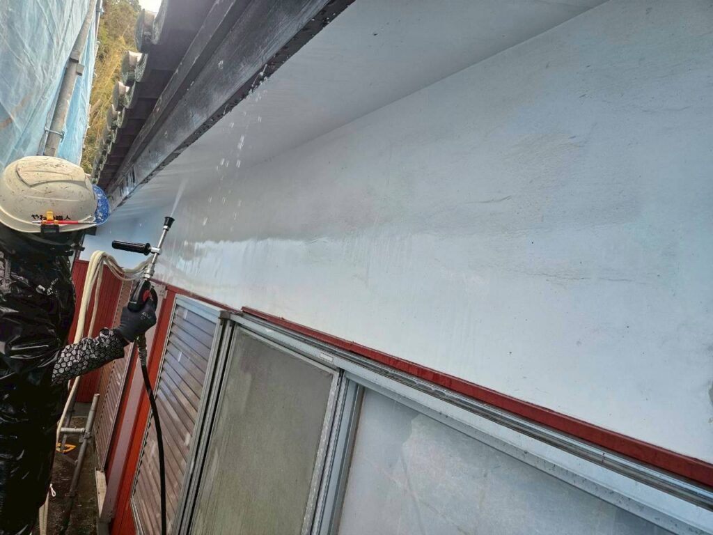 外壁全体の汚れ・コケ・古い塗膜をしっかり洗い流します。