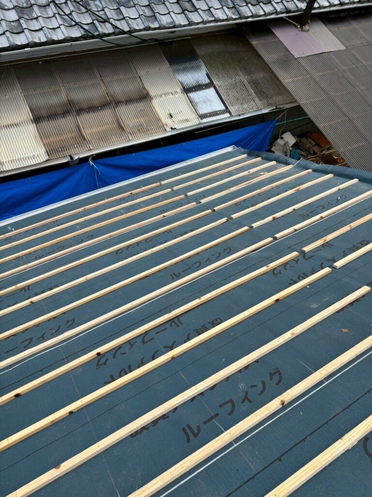 野地板の補修を行った後は、新しい防水シートを全面に施工します。