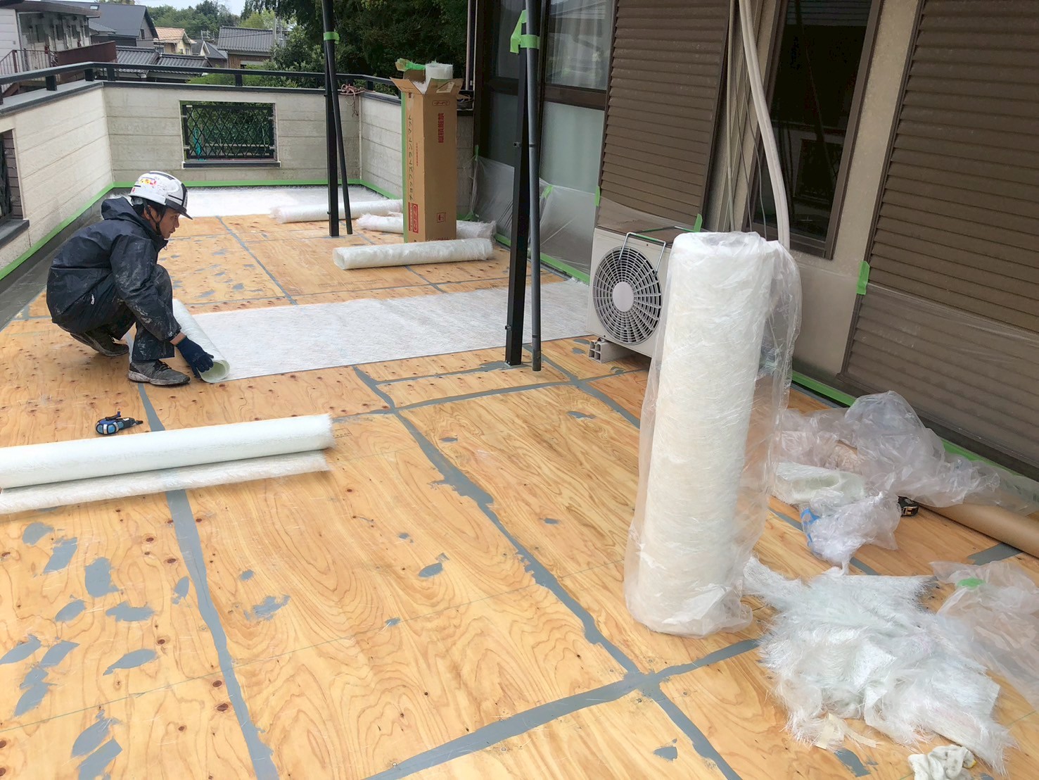 防水層の強度を高めるため、ガラス繊維でできたマット(ガラスマット)を床全面に敷き込みます。