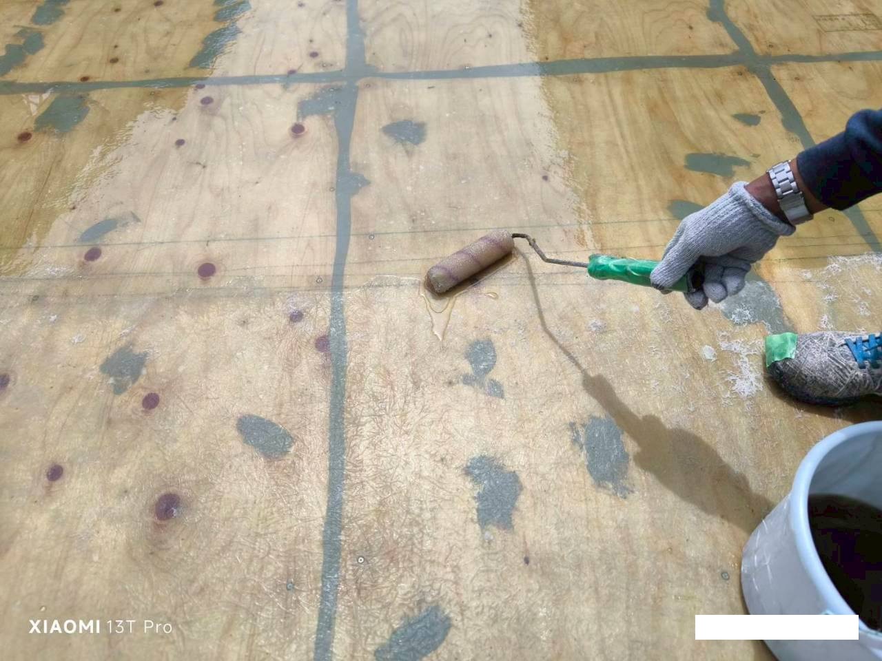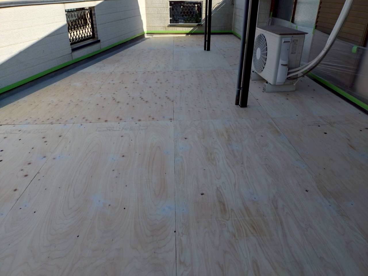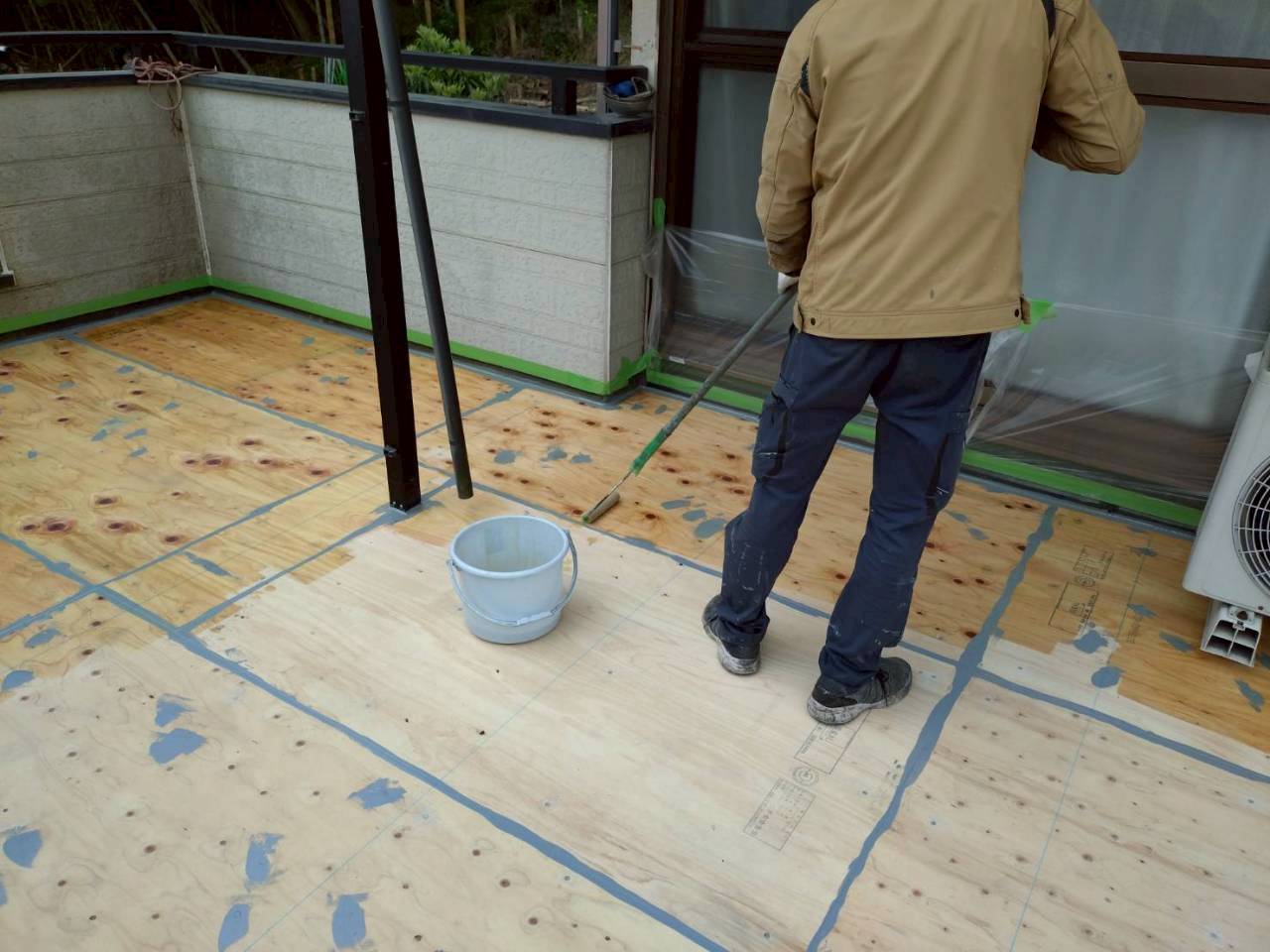 合板の継ぎ目に防水材を塗布、防水の密着性を高めるため、専用のプライマーを均一に塗布します。
