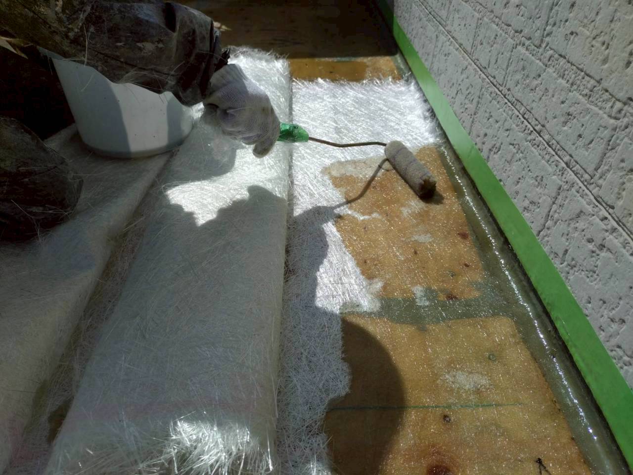 ガラスマットの上からポリエステル樹脂を丁寧に塗り込み、しっかりと含浸させます。