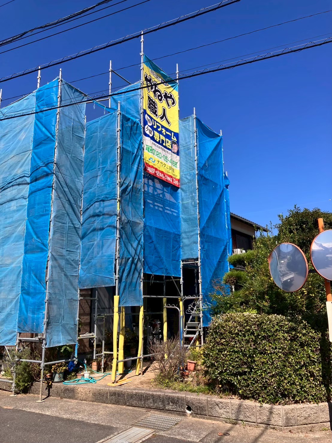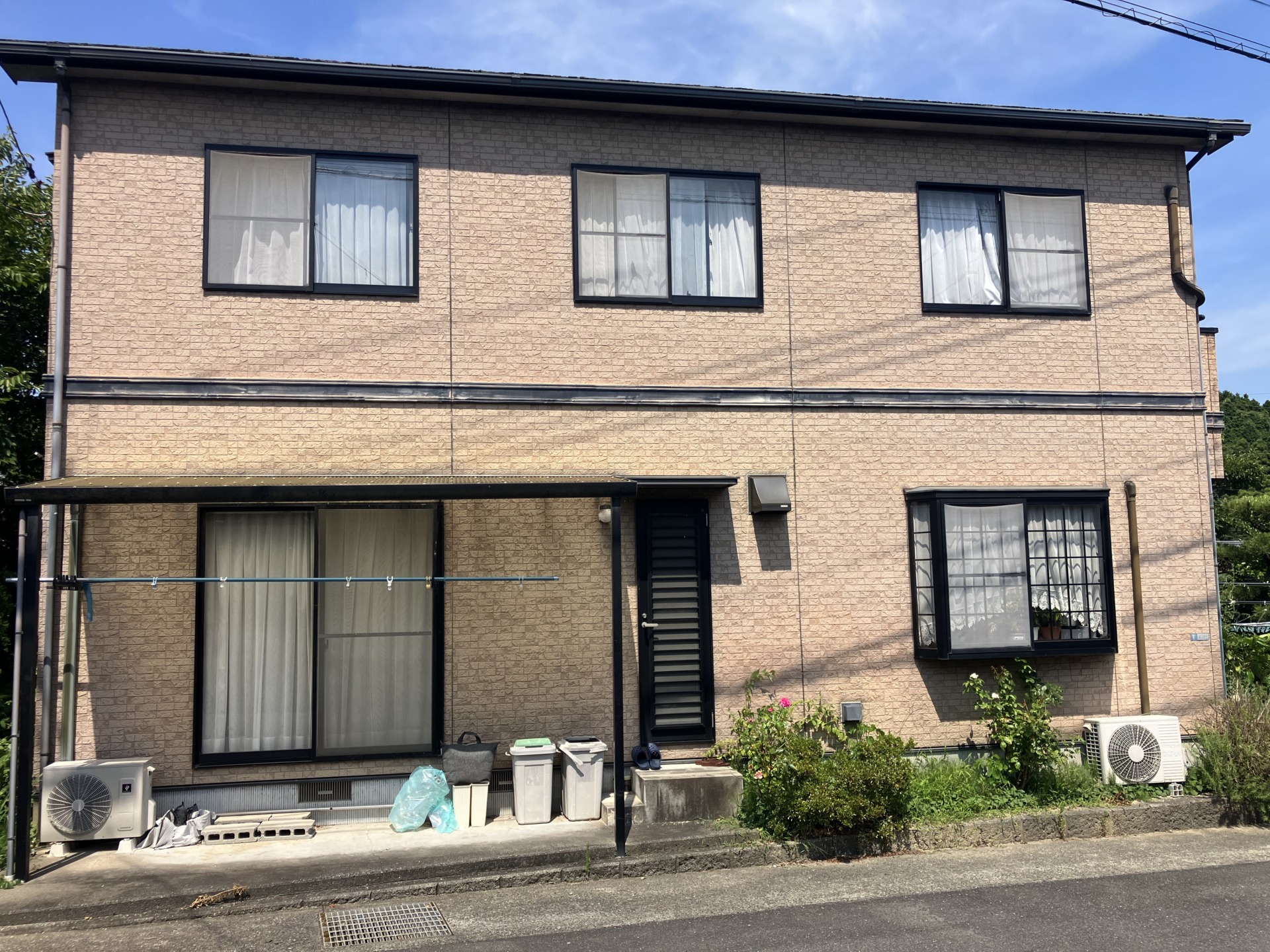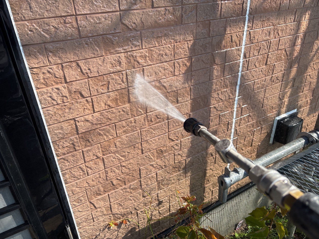 高圧洗浄機で外壁についた苔や汚れを落とします。