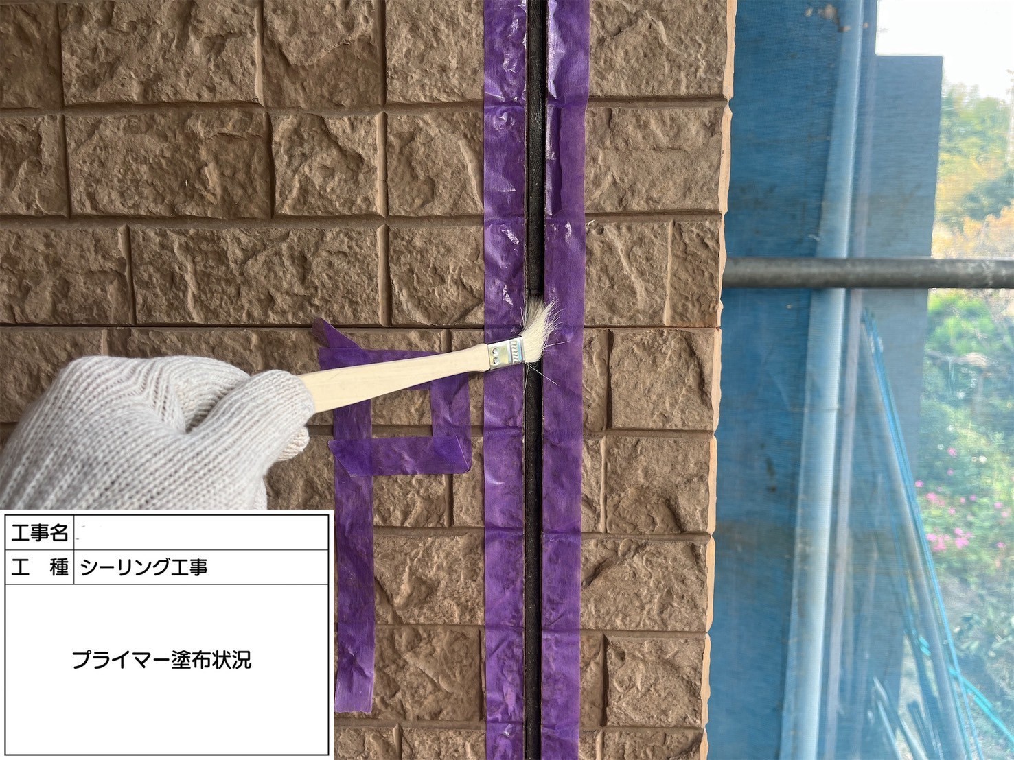 劣化した目地のコーキングを剥がしてプライマーを塗布します。