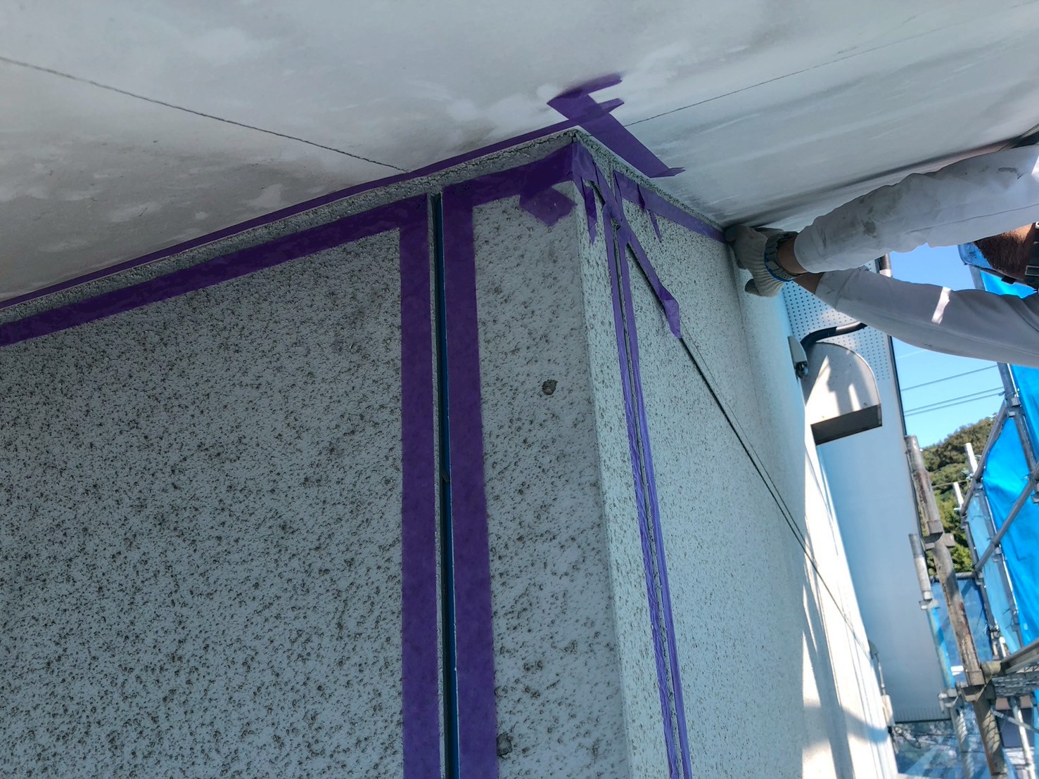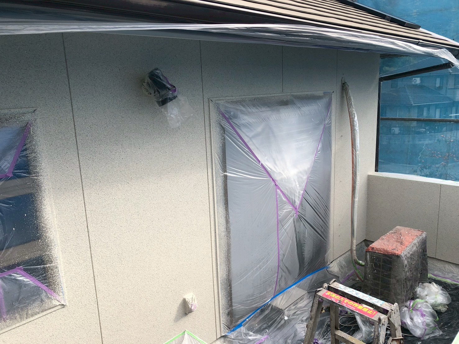 窓、センサーライト等に塗料が飛び散らないようにシート養生します。