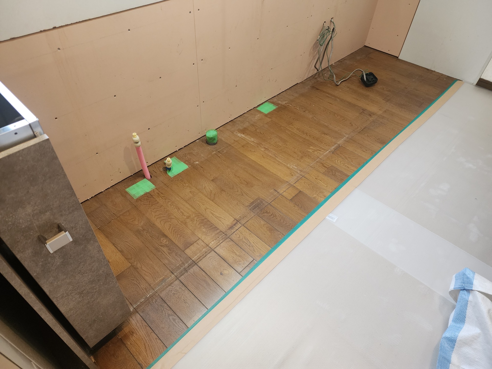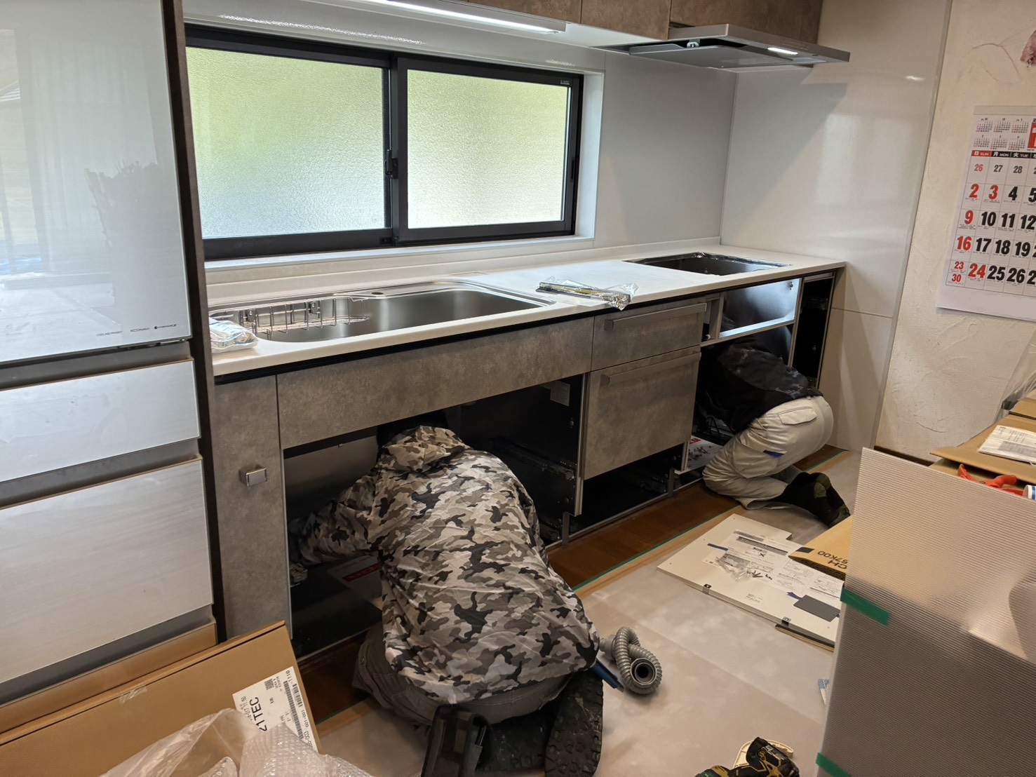 新しいキッチンの設置に合わせて給排水と電気の位置を調整します。