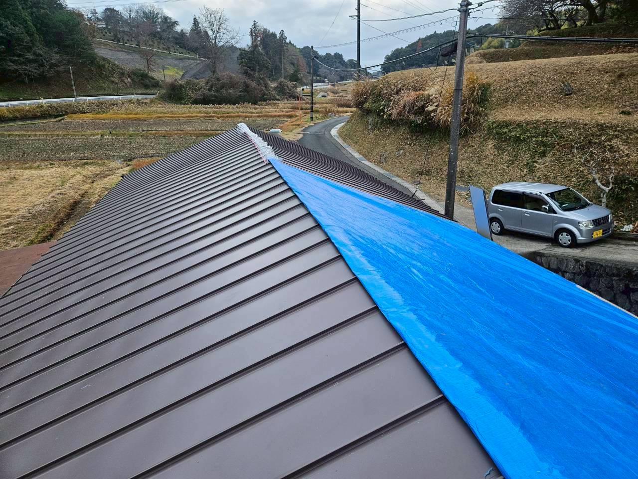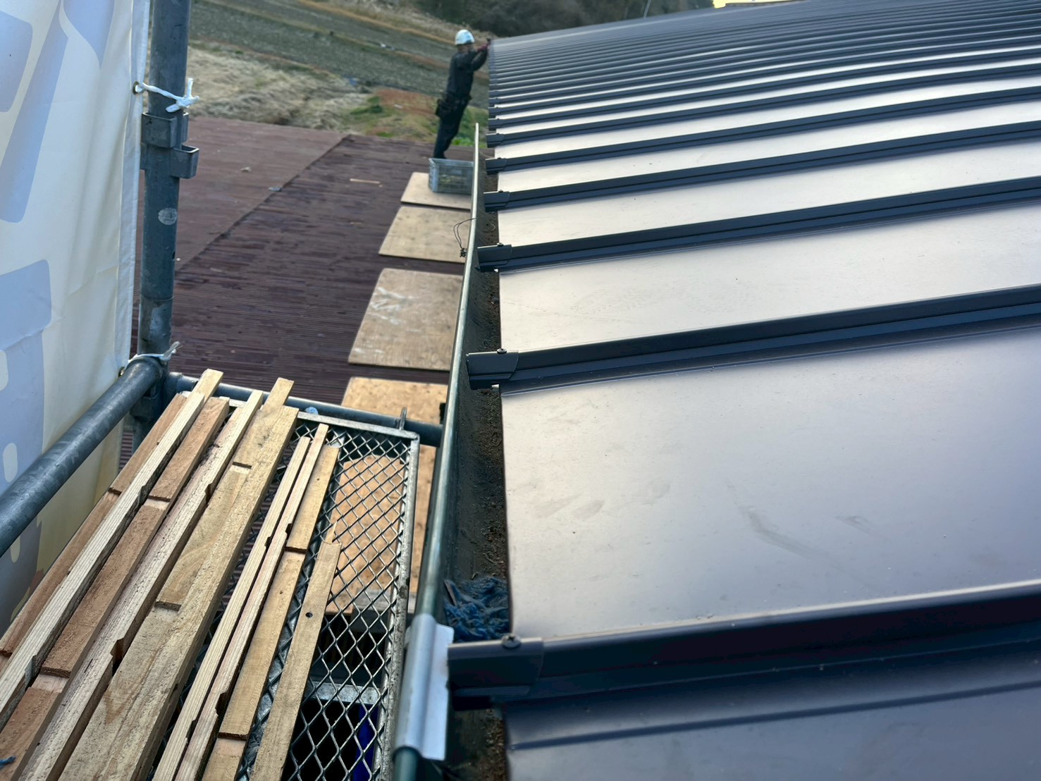 ガルバリウム鋼板が基材の縦葺き屋根材を施工します。