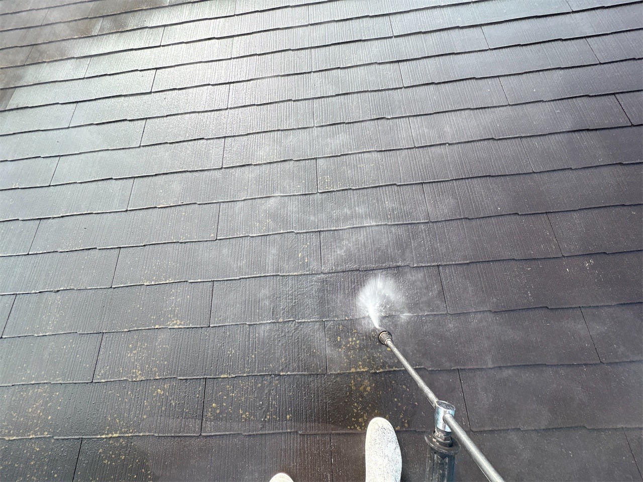 高圧洗浄機で汚れ、古い塗膜を落とします。